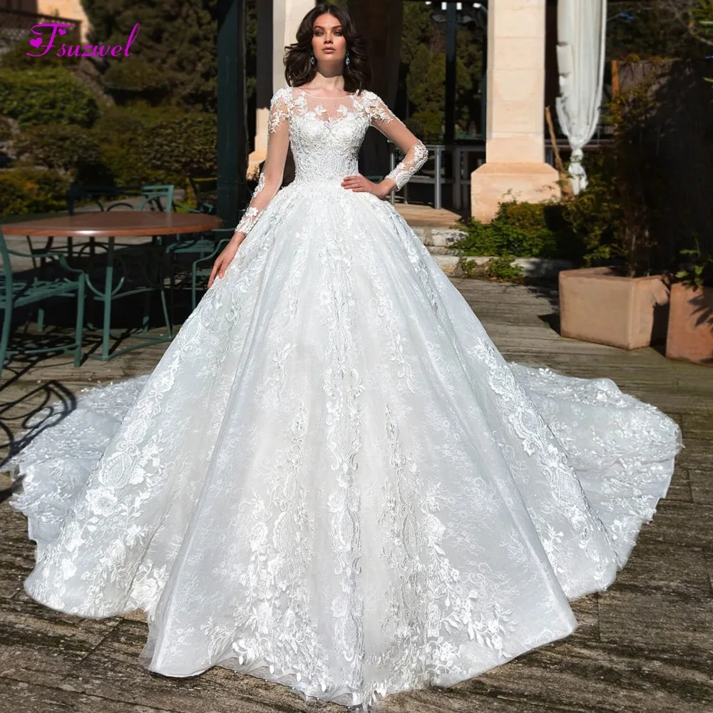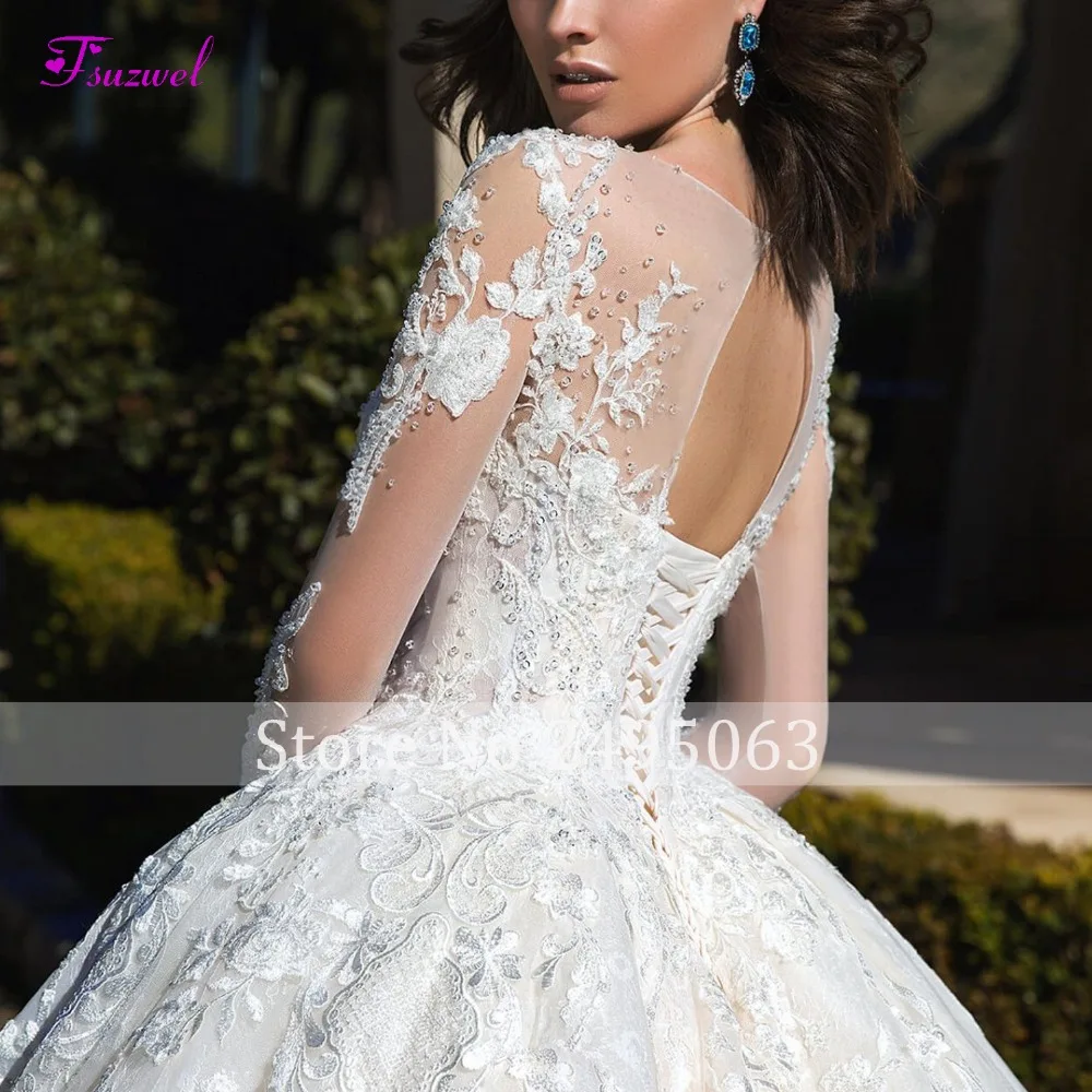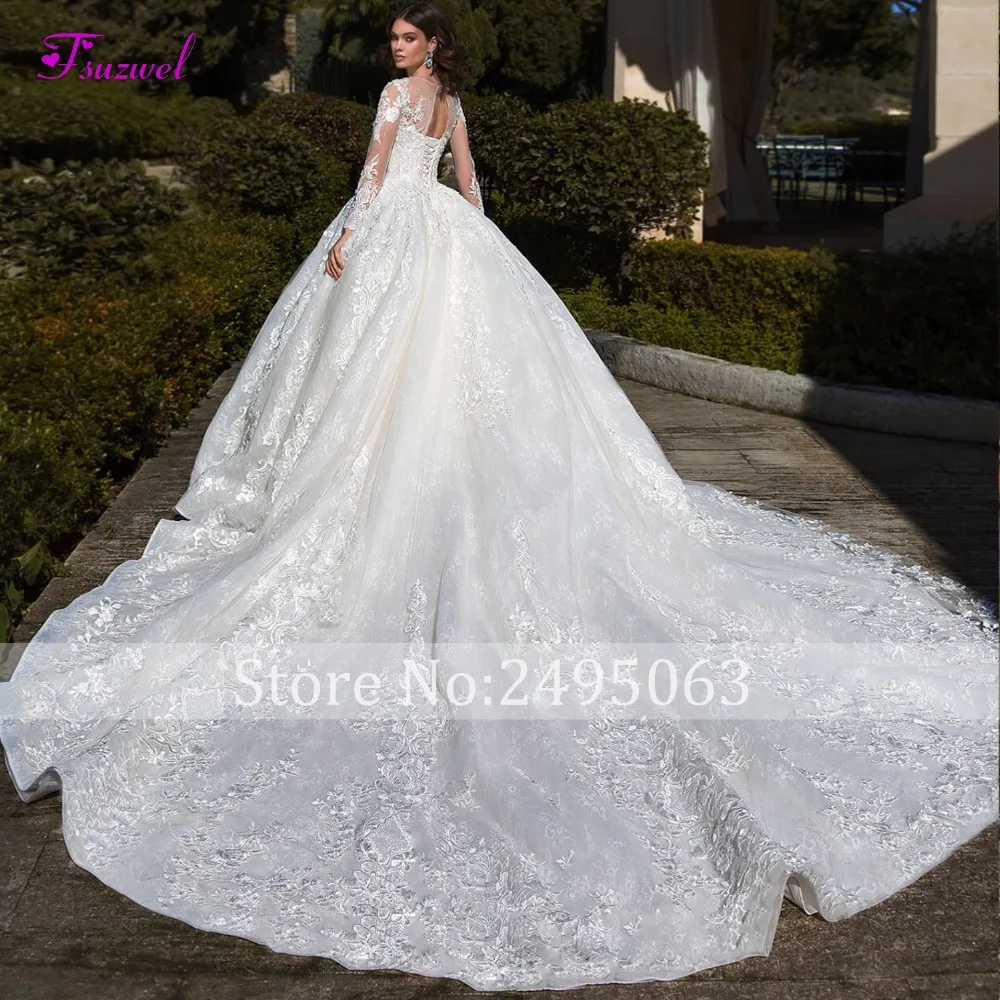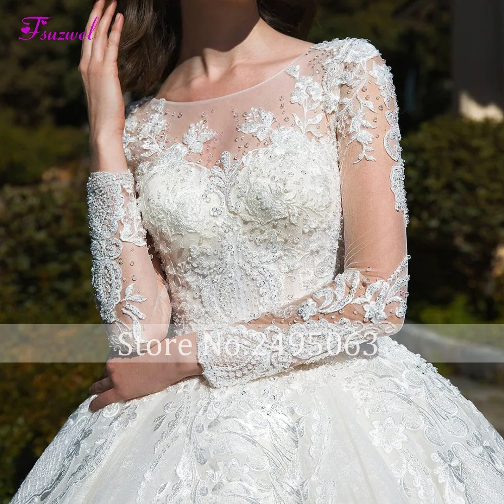 Fsuzwel Gorgeous Appliques Chapel Train Lace Ball Gown Wedding Dress 2019 Sexy Scoop Neck Long Sleeve Beaded Princess Bride Gown :Click Here