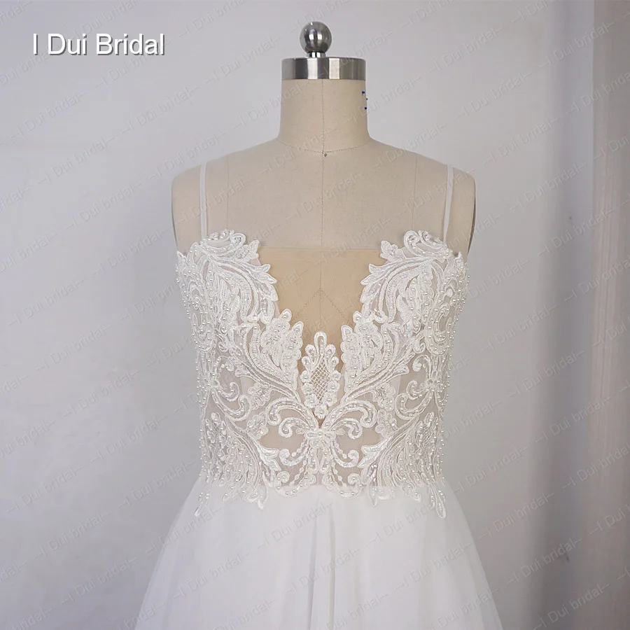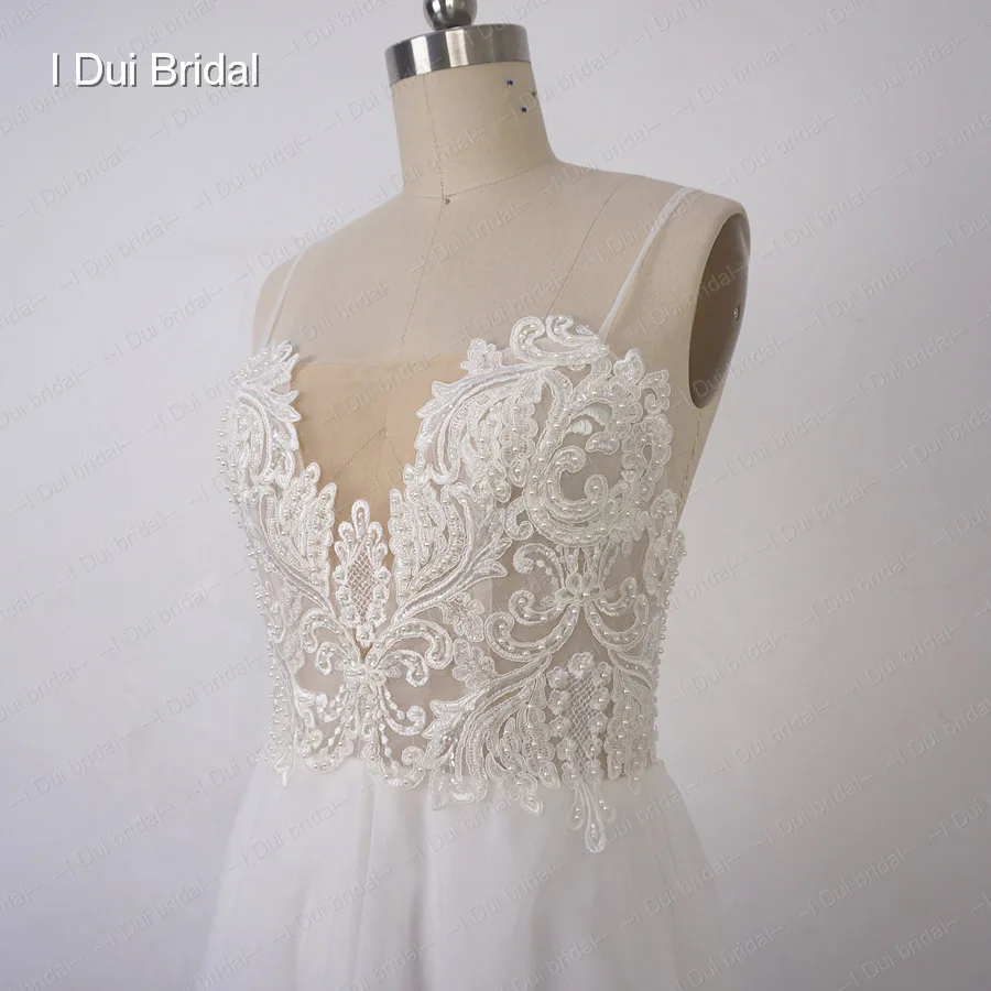 Spaghetti Strap Wedding Dress A Line Lace Appliqued Pearl Beaded Top Tulle Skirt :Click Here