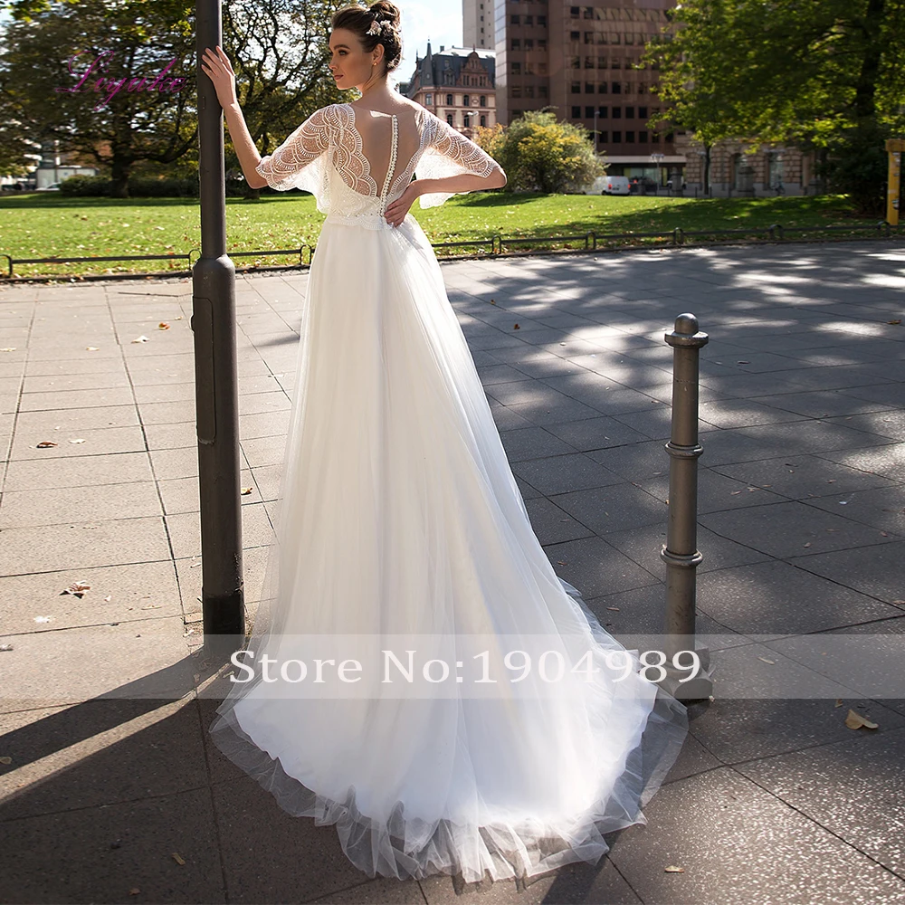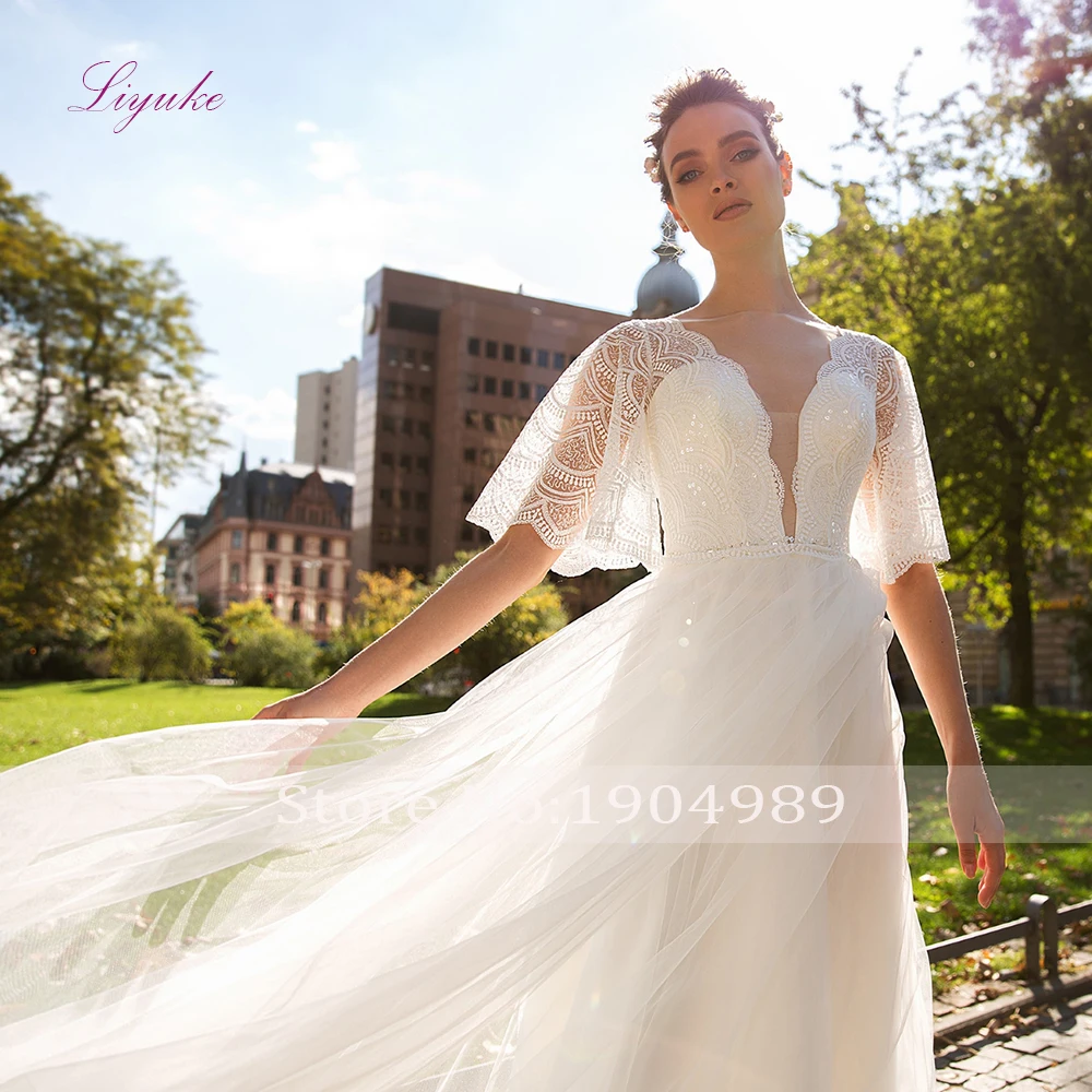 Liyuke 2019 Married A-line Wedding Dress Lace Flower Appliques Pattern Beading Sequins Flare Sleeves Customized :Click Here