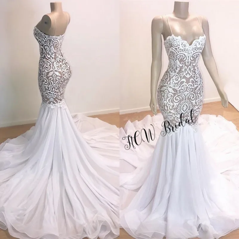 New Product Gorgeous Mermaid Lace Wedding Dress 2019 New Arrival Sweetheart Spaghetti Strap Sweep Train Unique