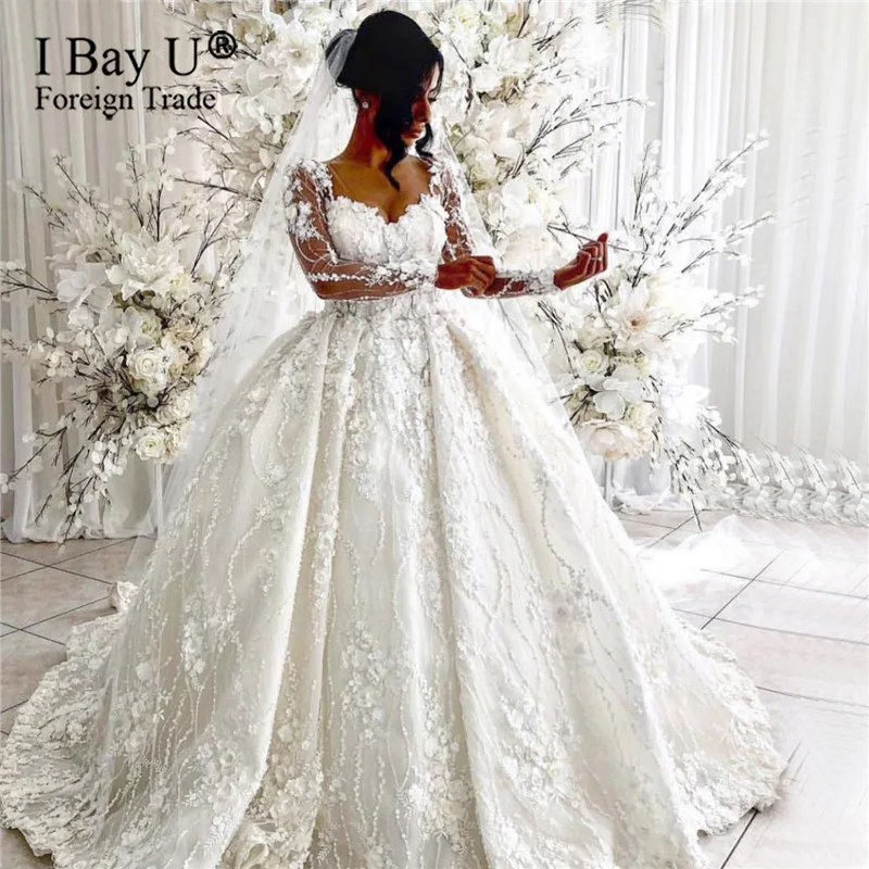 Luxury Shiny Crystal Wedding Dress Full Sleeves 2020 See Through Lace Appliques Puffy Ball Gowns 3D Flower Bridal Dress :Click Here