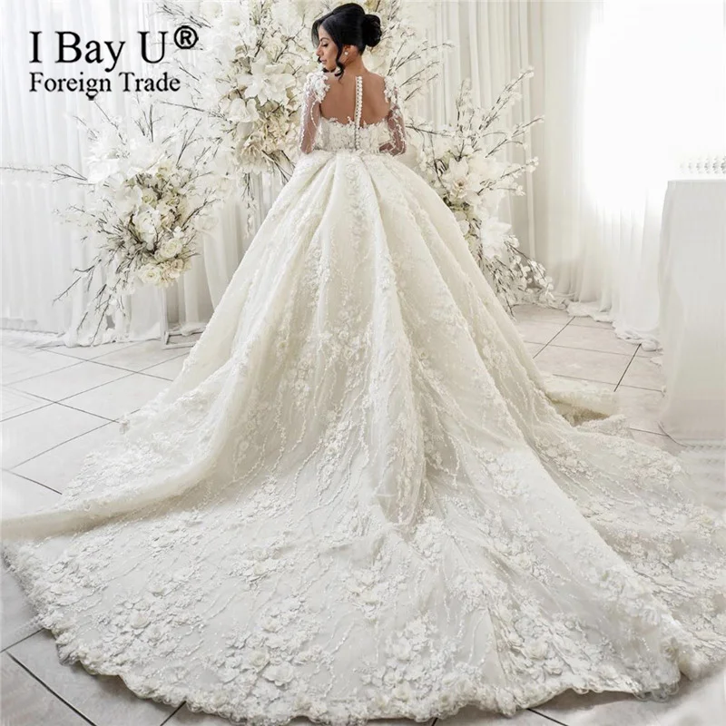 Popular Off White Handmade 3D Flower Lace Wedding Dress Long Sleeve 2020 Dubai V Neck Vintage Princess Brid