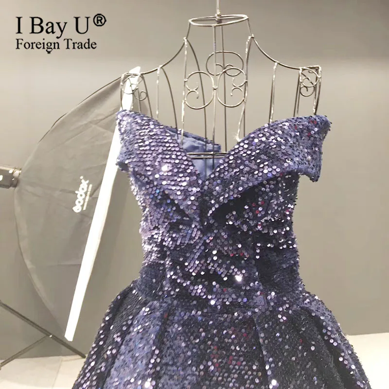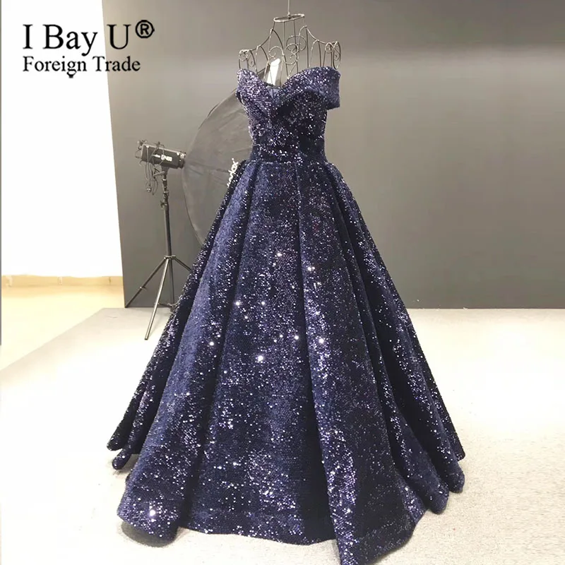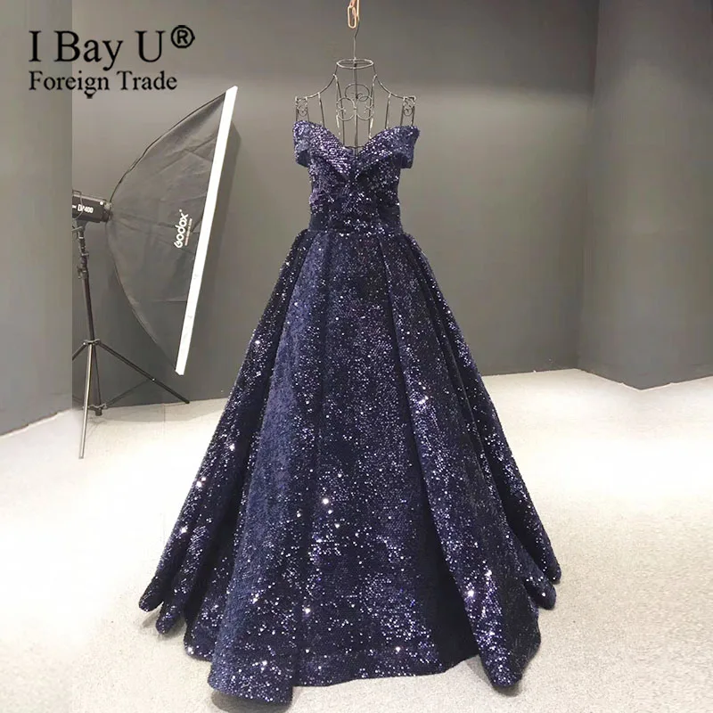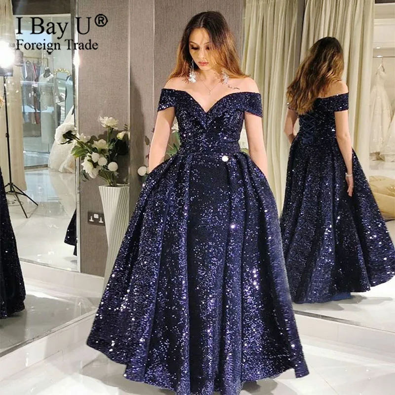 The Latest Navy Blue Sequin Arabic Muslim Formal Evening Dress Custom Made Evening Party Gown