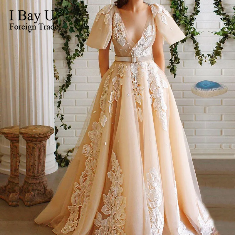 Trend Product Skin Color Illusion V Neck Party Evening Dress 2020 Tulle Prom Gowns With Lace Embroidery Lace Edge