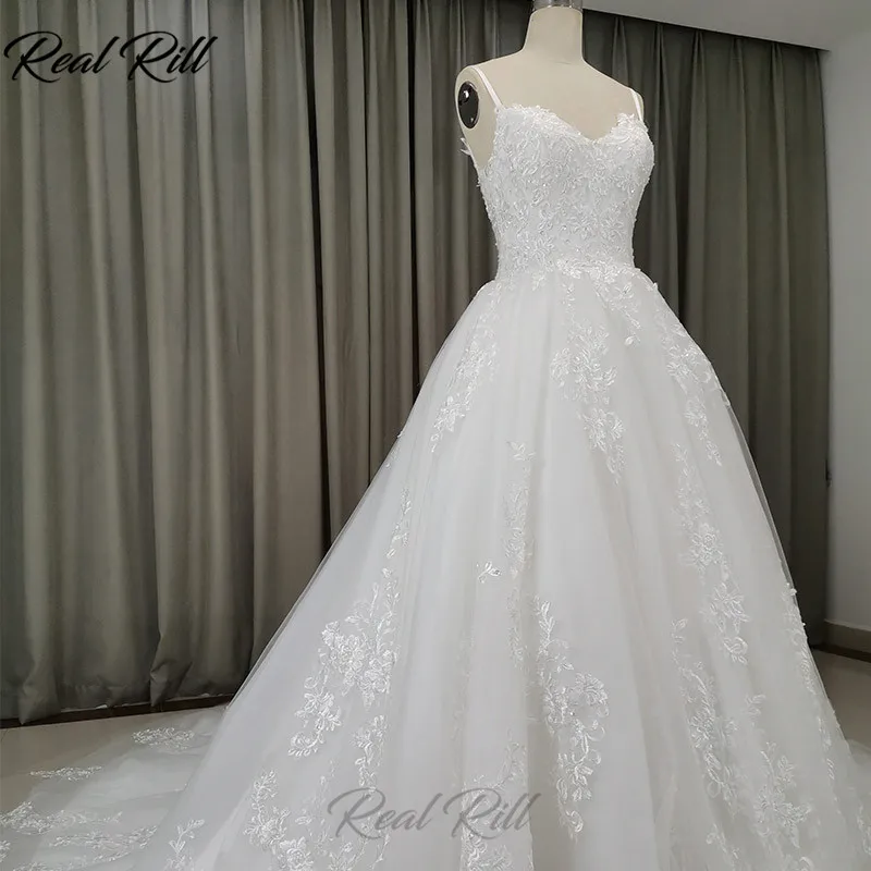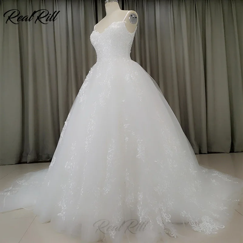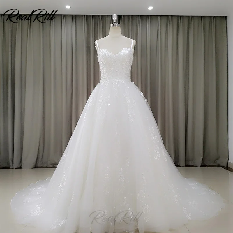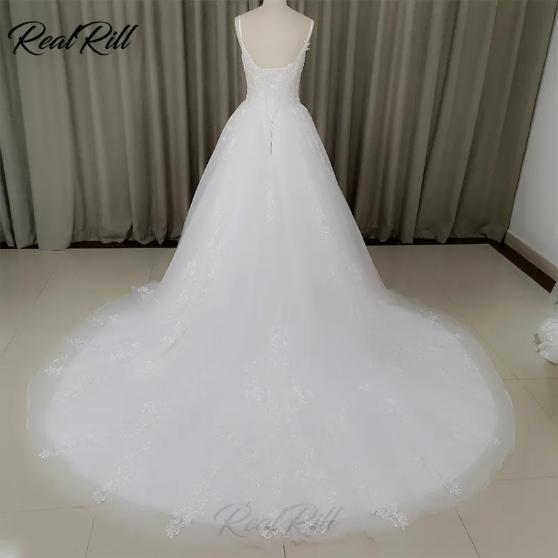 New Real Rill V-Neck Spaghetti Straps Wedding Dress 2019 Tulle Bride Dress With Lace Appliques & Sequin