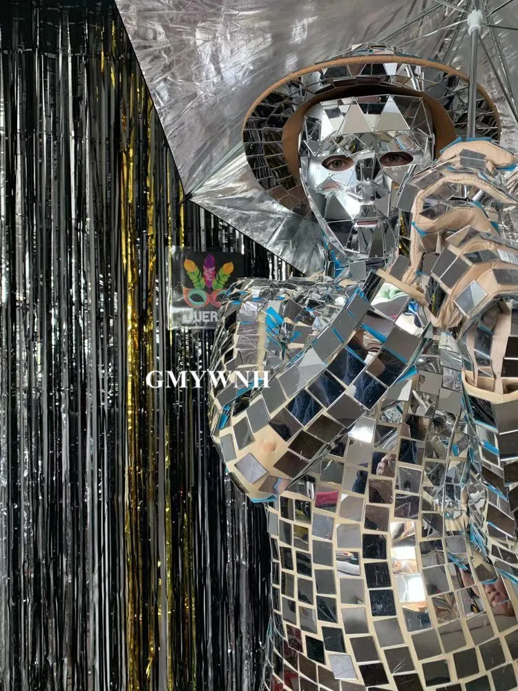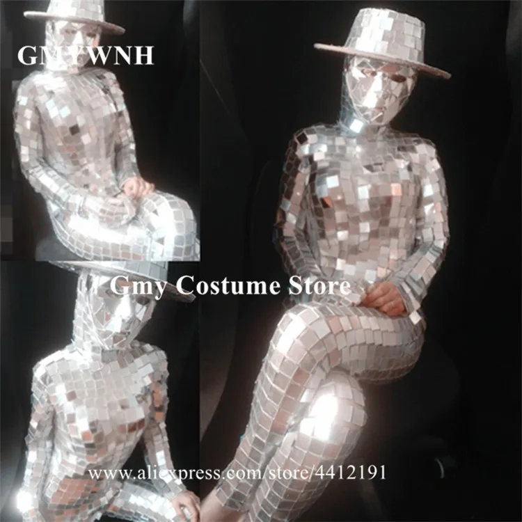 M55 Silver mirror costumes ballroom dance stage dress model wears bar performance outfits dj mirror bodysuit Mosaic clothes show :Click Here